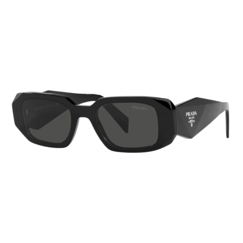 Acetate sunglasses with an oversized, geometric design. The bold frame front has an avant-garde silhouette defined by the extreme angled cut of the outer corners. The three-dimensional design of the temples is decorated with an iconographic interpretation of the traditional Prada triangle logo. Eye size: 48; Frame: Black; Lens: Dark Grey; Lens Material: Standard Plastic